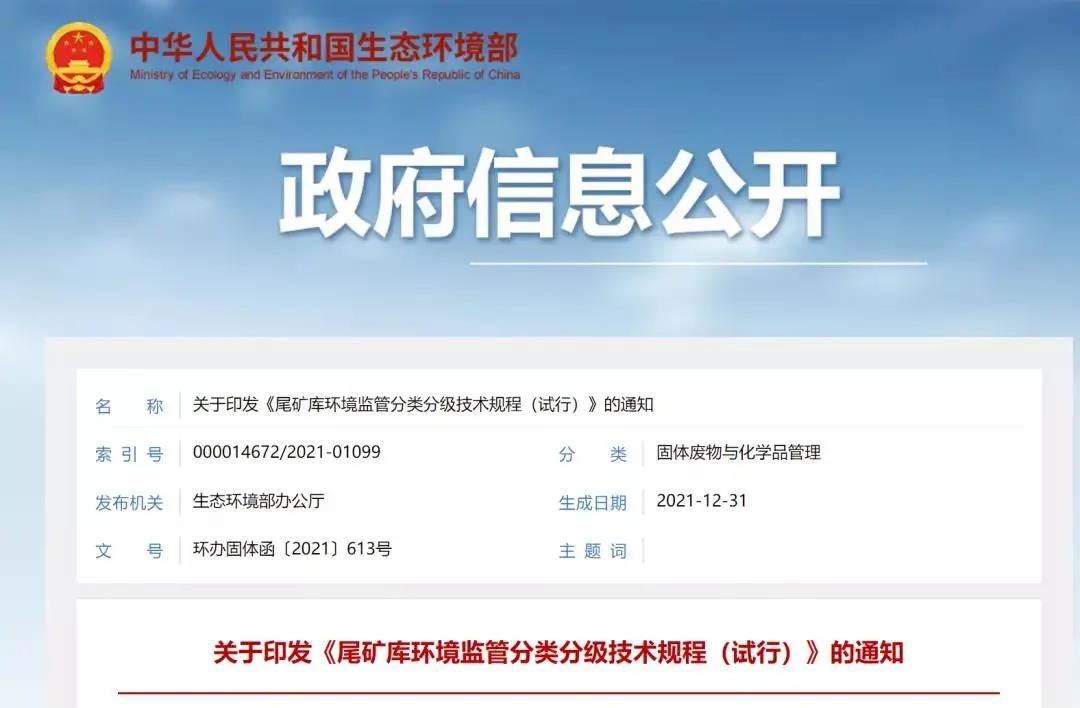 近日,生態(tài)環(huán)保部網(wǎng)站公布關(guān)于引發(fā)《尾款庫環(huán)境保護分類分級技術(shù)規(guī)程(試行)》的通知。根據(jù)通知《尾款庫環(huán)境保護分類分級技術(shù)規(guī)程(試行)》,該技術(shù)規(guī)程于2021年12月31日生成。這是尾款庫監(jiān)督管理方面極其重要的一項新的技術(shù)規(guī)程。